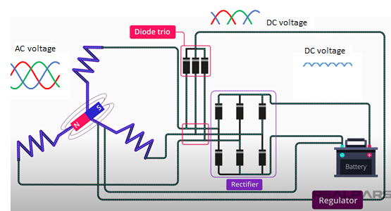 Stator 출력 - Rectifier는 3상 전압을 차량 전장 전원 공급을 위해서 단상 DC 전원으로 변환한다. 일반적으로 100A이상의 대용량 다이오드가 사용되고 있다