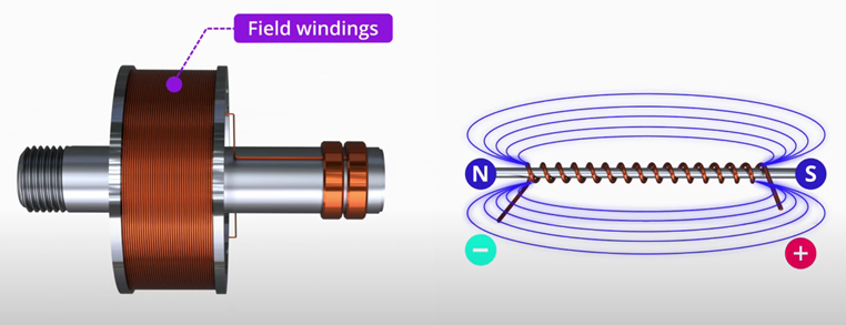 알터네이터 주요 부품 - Rotor (회전자) 내부에는 코일이 감겨 있으며, 배터리에서 자계 전원을 공급하게 되면 코일에 전류가 흘러서 자계가 형성되게 된다. 이는 Wound field 모터에서 자석의 역할을 field windings과 field voltage가 대체하듯이, 알터네이터에서도 같은 컨셉으로 작동한다.