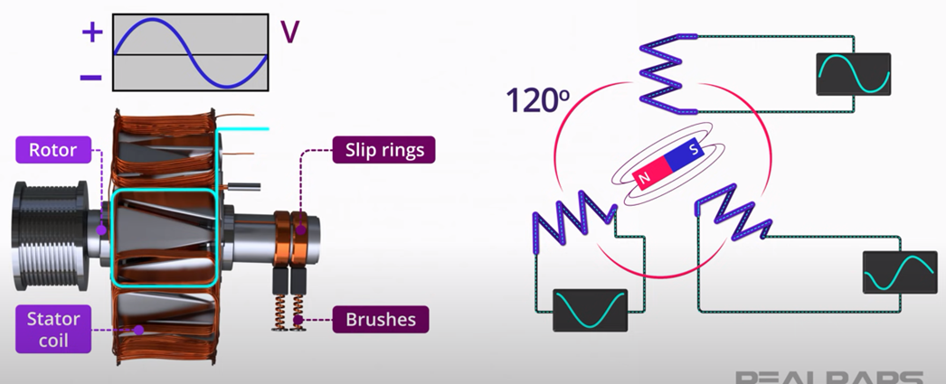 알터네이터 Rotor (회전자) - Stator (고정자) 내부에는 3개의 코일이 120도 간격으로 감겨 있으며, Rotor가 회전하게 되면 120도의 위상을 가지는 3상 AC 전압이 Stator에 유기된다.