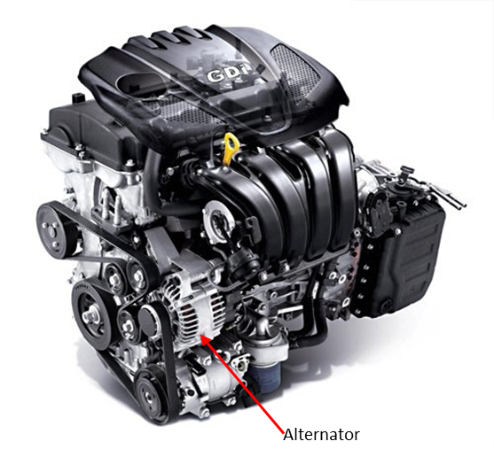 알터네이터는 벨트에 의해서 엔진과 연결되어 있으며, 스타터에 의해서 엔진 시동이 성공하면 엔진은 아이들 스피드를 유지하며, 엔진 벨트에 의해서 알터네이터, 에어컨 컴프레서, 조향 장치를 구동하게 된다.