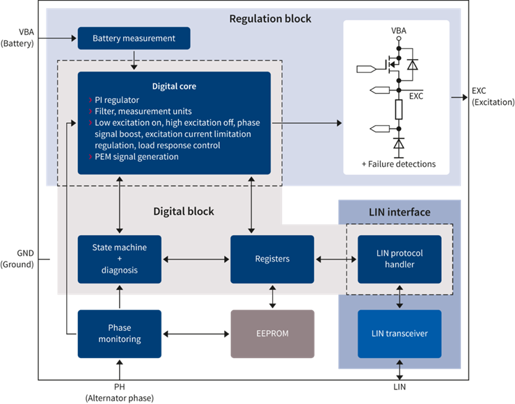 Voltage Regulator - 알터네이터용 반도체는 Voltage regulator내부에 위치한다. 아래는 TLE888x 반도체의 블럭다이어그램이다. Diode Trio의 출력 전압이 PH핀에 입력으로 들어와서 반도체 내부에서 속도 감지, 위상 전압 모니터링, Self start wakeup을 수행한다. 이와 함께 배터리 전압을 센싱하고 내부 제어회로 통하여 Field winding을 여자(excitation)시킨다. 이를 통하여 발전 전압 및 전류를 제어한다. 엔진 제어기와 LIN 통신을 통하여 정보를 주고 받는다.