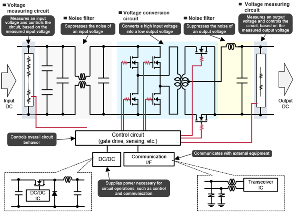 EV나 FCEV 차량에서는 알터네이터를 구동할수 있는 엔진이 없고, 큰 고전압 배터리가 있기 때문에 고전압에서 전장용 저전압으로의 변환이 필요하다. DC/DC 컨버터가 그 역할을 수행한다.