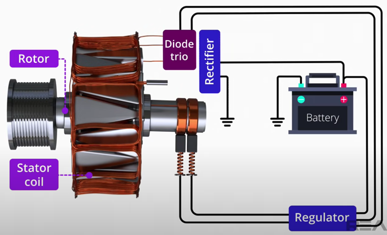 GDI 엔진 알터네이터는 Rotor (회전자), Stator (고정자), Rectifier (정류자), Diode trio, Regulator로 구성되어 있다.