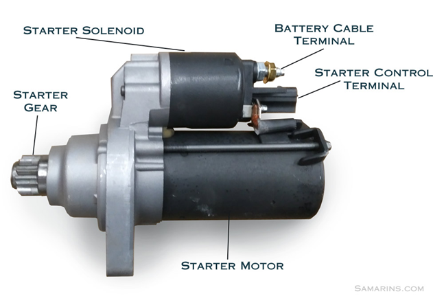 스타터 모터는 엔진을 기동시키기 위한 모터이다. 배터리에서 전력을 공급받아서 엔진이 자체적으로 움직일 때까지 엔진을 구동시켜주는 역할을 수행한다. 상세 동작은 아래와 같다.