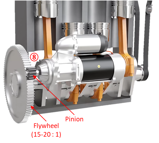 9. Flywheel과 Pinion의 기어비로는 엔진을 구동시키기에 충분하지 않기 때문에, 스타터 모터 내부에는 Planetary gear가 있으며, 일반적으로 3-5 대 1의 기어비를 가지고 있다.