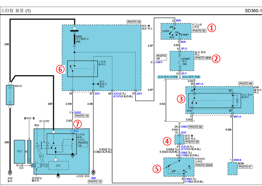1. 운전자가 이그니션 스위치를 Start 위치로 돌릴 때, 배터리 전류가 이그니션 스위치의 Start 접점을 통해서 흐른다.