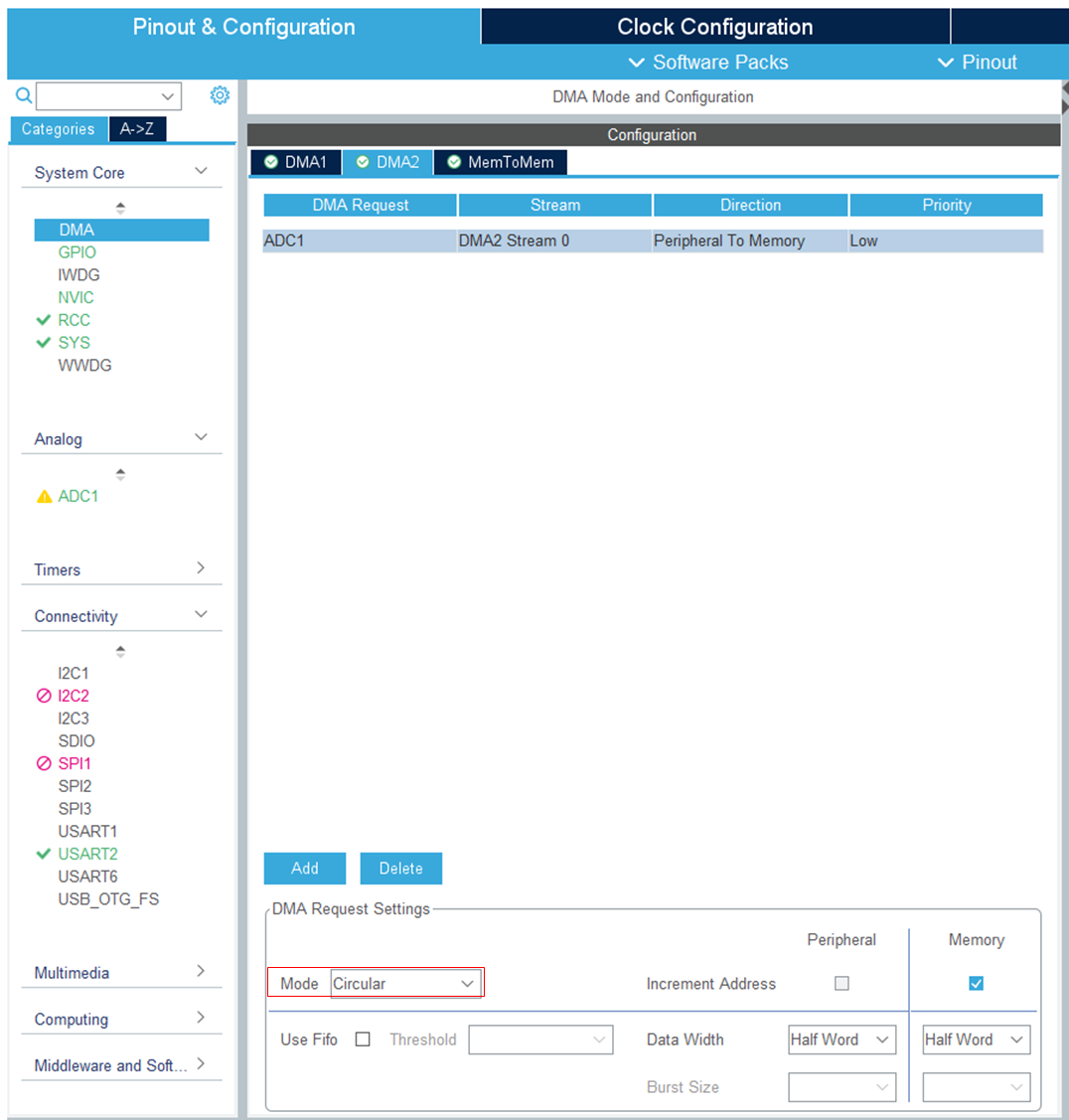 DMA 설정에서 모드를 Circular로하여 지속적으로 변환하도록 설정한다.