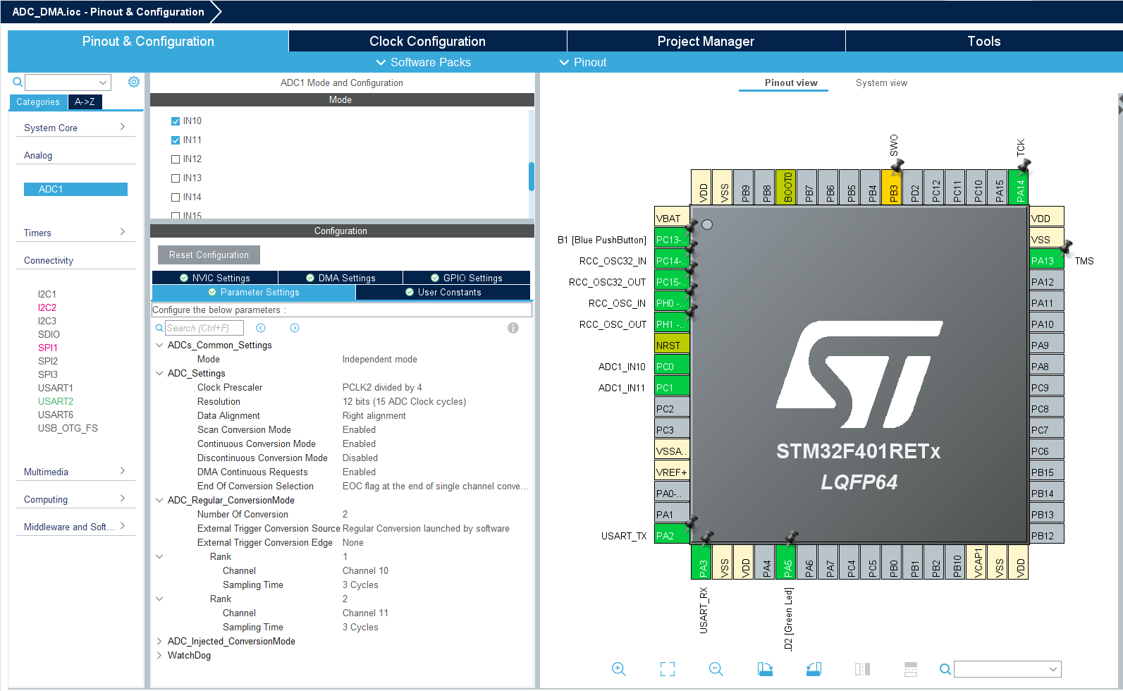 STM32F401 Ucleo 보드에서 ADC1의 IN10과 IN11을 이용한다. 이를 위해 필요한 설정은 아래와 같다. Continuous Conversion Mode를 enabled하고 DMA Continuous Requests를 enable한다. DMA continuous requests는 DMA 설정을 한 후에 선택 가능하다. 2개의 채널을 변환하기 위해서 Number of conversion을 2로 설정하고 Rank1과 Rank2를 채널에 맞게 설정한다. ADC는 APB1 클럭을 이용하기 때문에 변환에 APB1 클럭의 3 cycle이 이용된다.