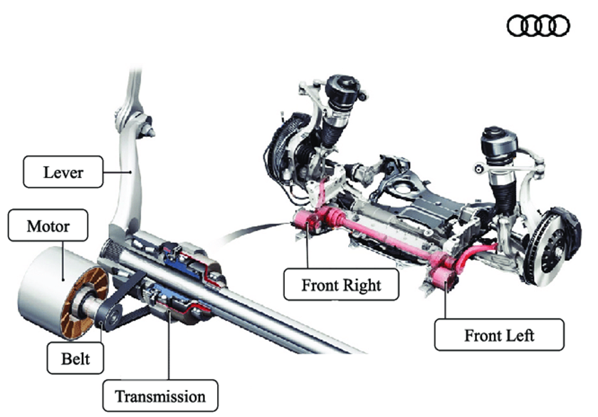 Geared electric motor active suspension system of Audi (2017). ECS에는 보통 저렴한 DC 모터가 AES에는 고가의 BLDC가 사용된다.