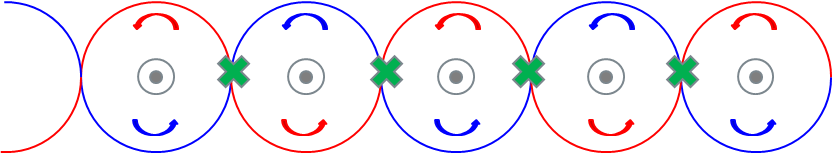 외부 노이즈에 의한 전자기 반면에, 외부 노이즈(자기장)가 트위스트 와이어에 앞 방향으로 가해지면 첫번째 원과 두번째 원에서 전류의 방향이 반대가 되기 때문에 외부 노이즈에 의한 영향이 상쇄된다.