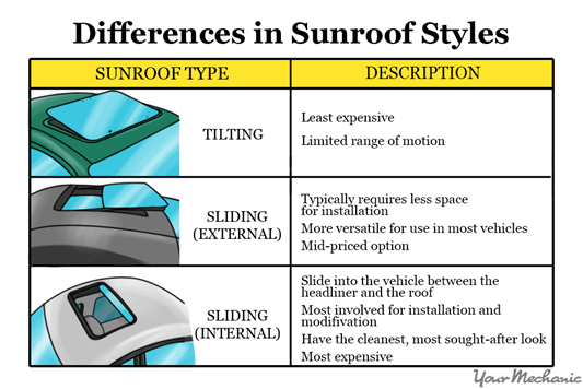 선루프는 틸팅, 슬라이딩, 파노라마 선루프 등의 형태가 있다.