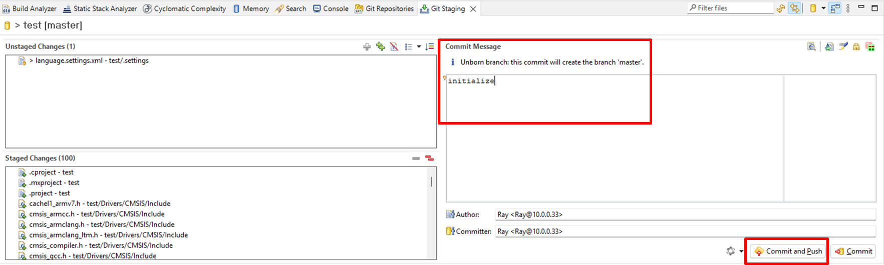 Commit Message에 관련 변경 내용을 작성하고 Commit and Push를 누른다. Commit을 하면 STM32CubeIDE에 있는 파일들이 C:\\Users\user name\git\test 폴더로 옮겨지고, Push는 파일들을 github로 옮겨진다.