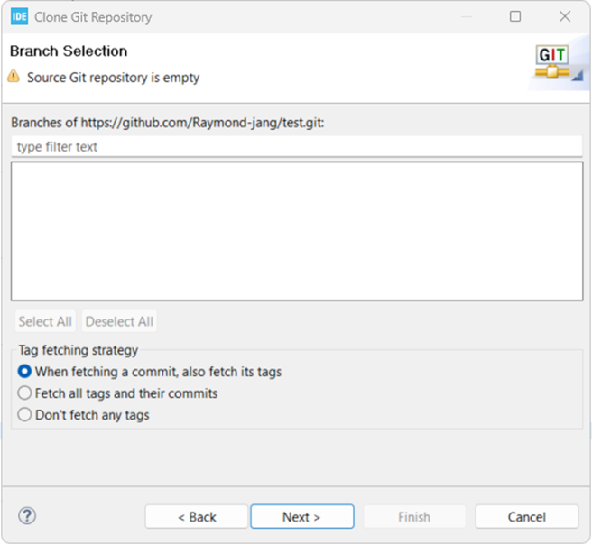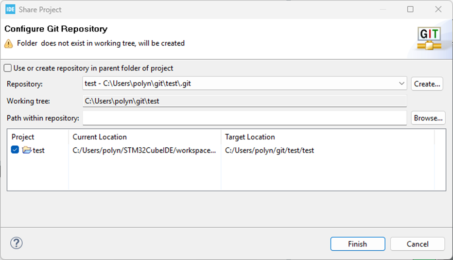 다음 창에서 Directory에 내 컴퓨터에 있는 git/test 폴더를 입력하고 finish한다.
