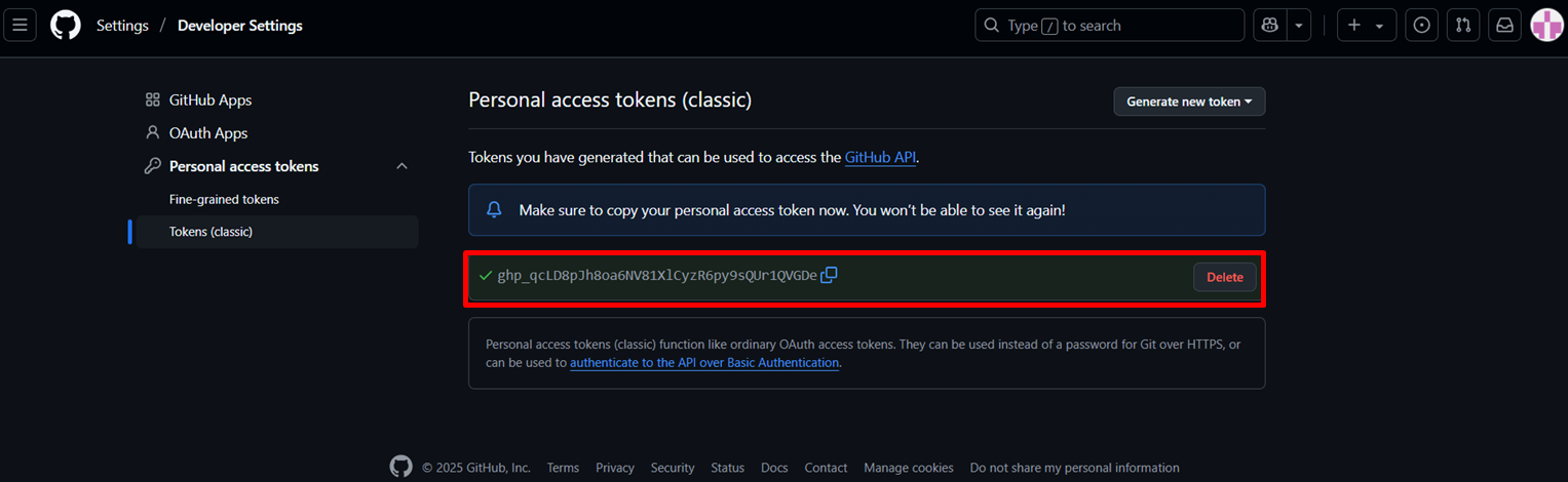 "토큰 생성"을 클릭하고 안전한 곳에 보관해야 한다. 토큰은 한 번만 표시되며 나중에 복구할 수 없다. 잃어버렸을 경우 delete하고 다시 생성하면 된다.