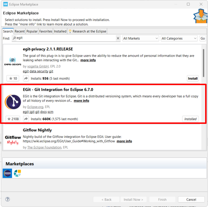 Help > Eclipse Marketplace > EGit 검색 및 설치, 설치가 완료되면 STM32CubeIDE를 다시 시작한다.