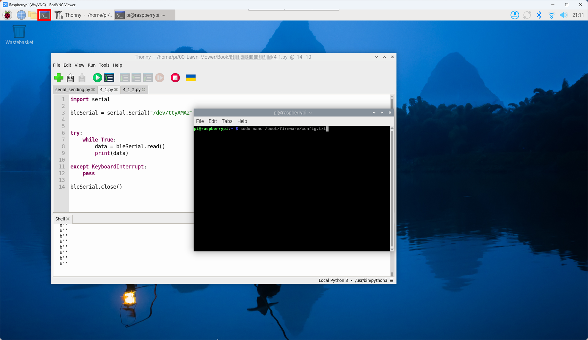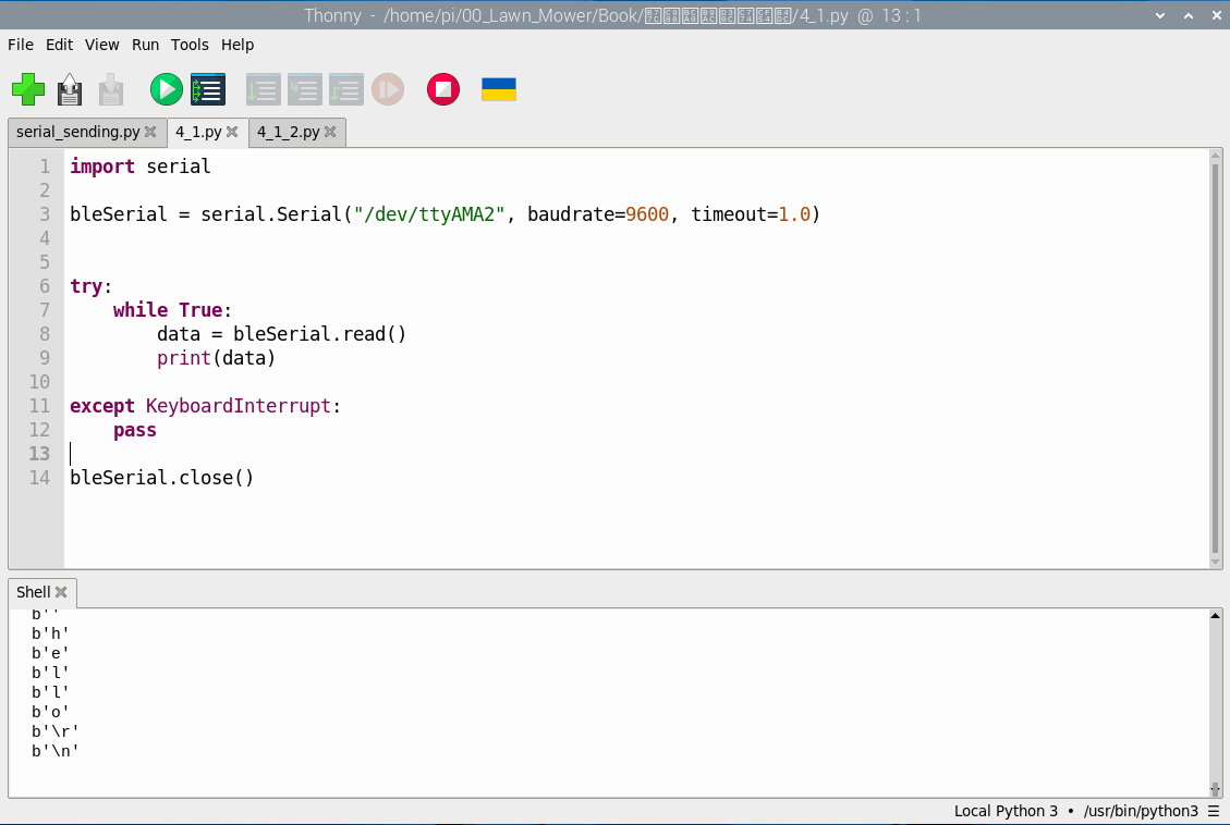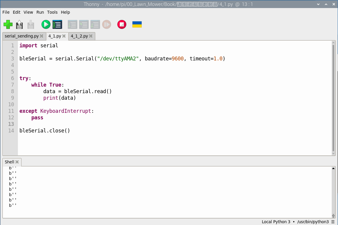 RealVNC에서 Programming > Thonny를 오픈해서 아래와 같이 코딩을 입력해주면 블루투스를 통해서 입력받은 문자를 하나씩 출력해준다. 지금은 아무 문자도 받지 않기 때문에 b' '로 출력되고 있다.