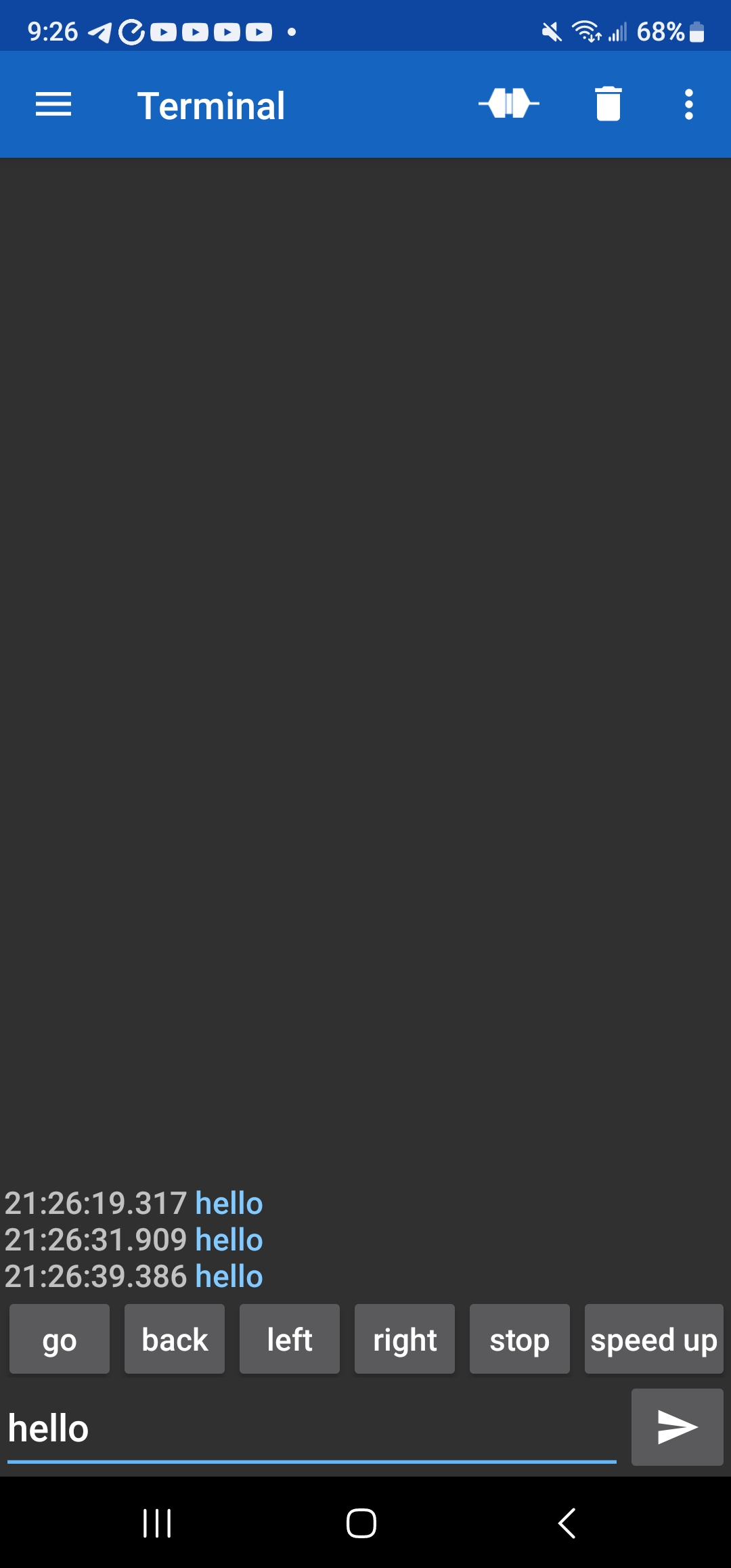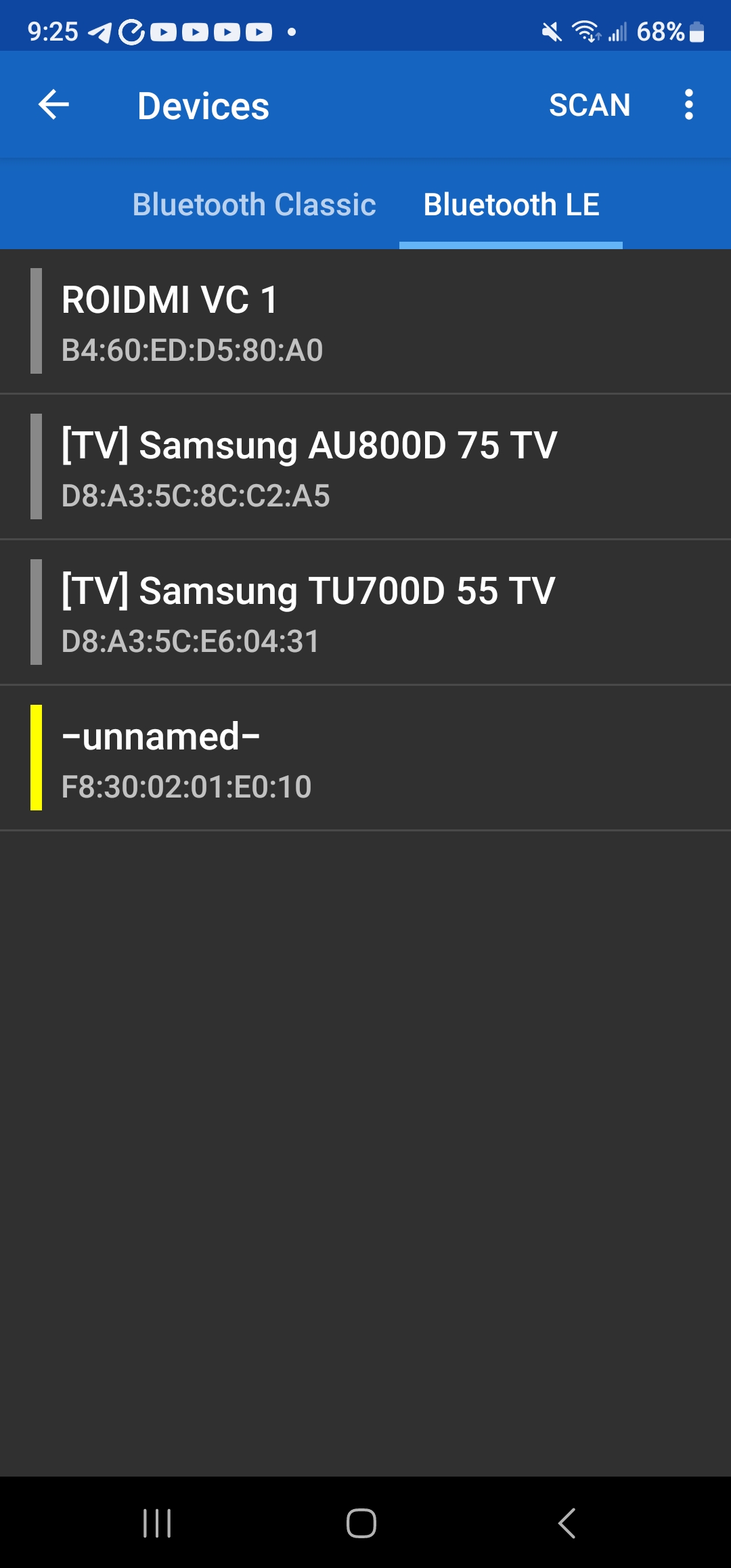 핸드폰에서 Serial Bluetooth Terminal 앱을 설치한다. 설치후 Devices에 가서 Bluetooth LE를 누르면 아래와 같이 화면이 나온다. HM-10은 이름 없는 unnamed로 나온다. 클릭후 hello를 아래 창에 입력하고 send 버튼을 누르면 Thonny에서 hello가 하나의 문자로 출력된다.