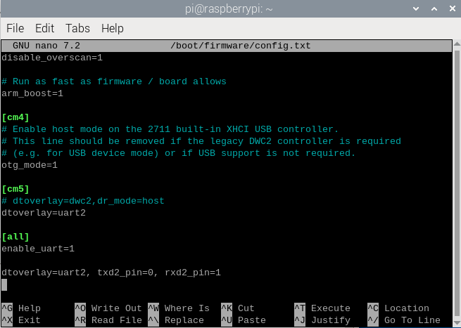 2. UART2를 활성화 하기 위해서 /boot/firmware/config.txt를 편집