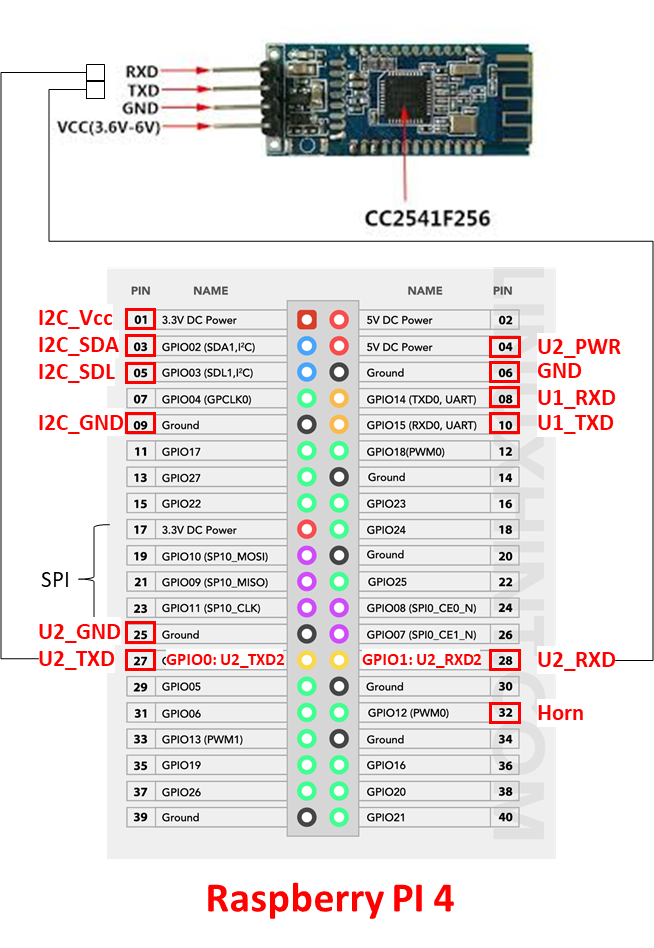 이중 GPIO0 (Pin27)과 GPIO1(Pin28)을 사용한다. HM-10 블루투스 통신모듈과 라즈베리파이4를 아래 그림과 같이 연결한다.