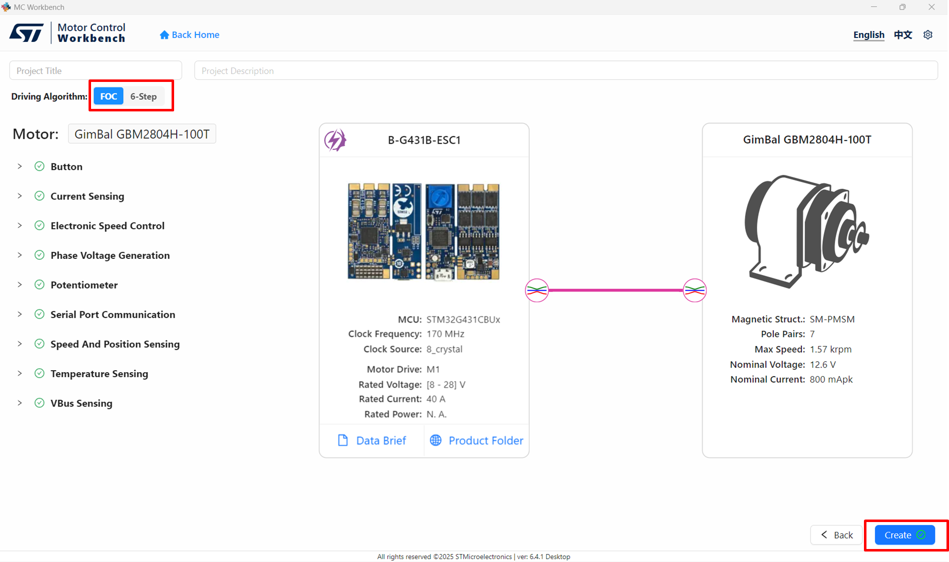 FOC를 생성할 것인지 6-Step 제어를 생성할 것인지 결정한 다음에 아래에 있는 Create 버튼을 클릭한다.