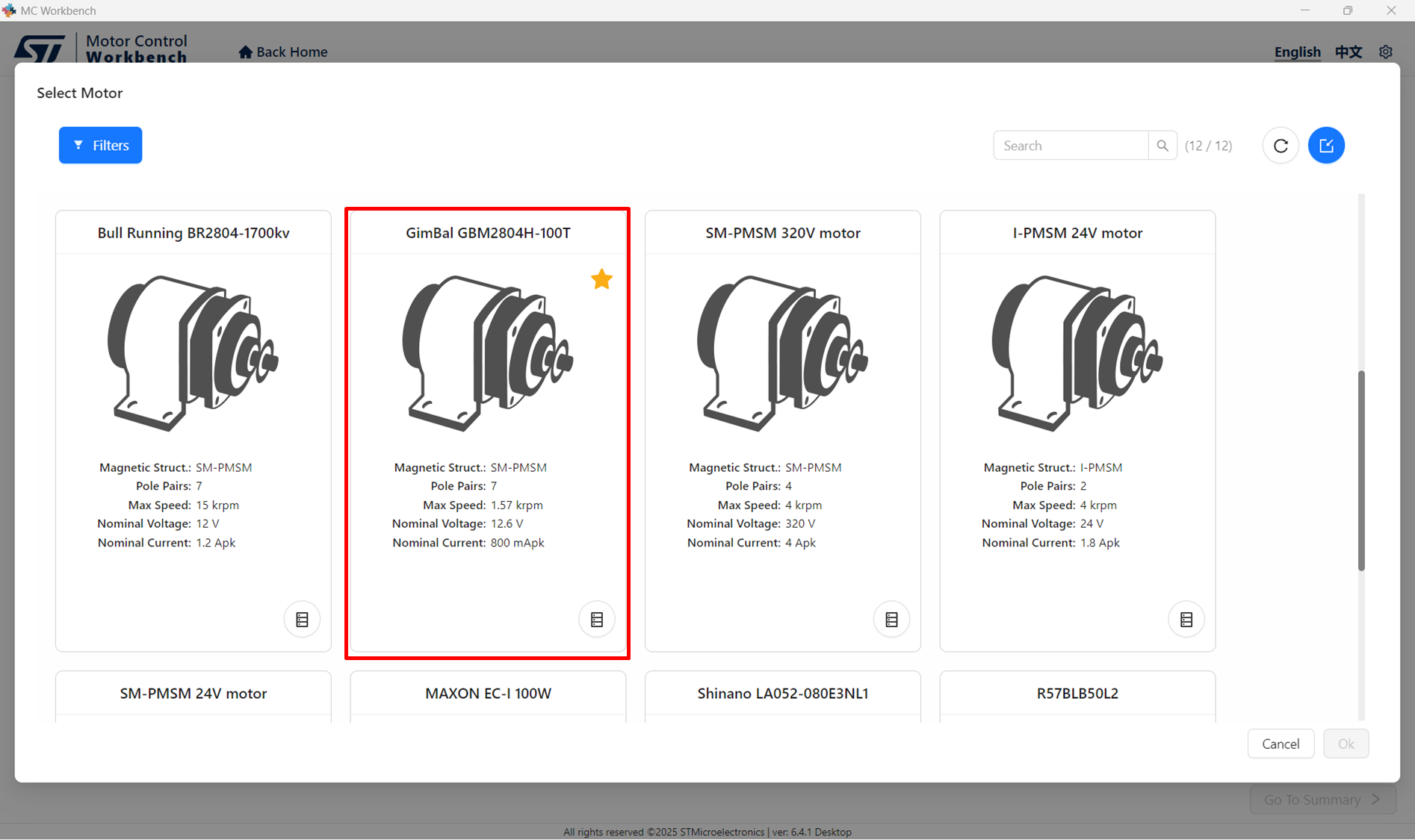 AS5600 Board에서 B-G431B-ESC1을 선택하고, 모터는 입력 전압과 최대 rpm이 그나마 유사한 Gimbal GBM2804H-100T를 선택하였다. MC Workbench에 MAD 5005 모터가 없기 떄문에 주요 파라메터에 대해서 수정을 해주어야 한다.