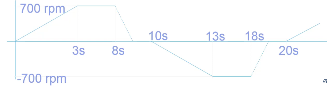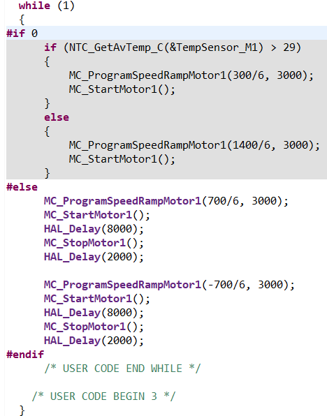 코드는 아래와 같이 main() 함수에서 작성하면 된다. 위의 코드는 제어 보드 온도가 29도를 넘으면 속도를 1400rpm에서 300rpm으로 낮추는 것이고 아래 코드가 위의 그림과 같이 속도제어를 위한 코드이다. MC_ProgramSpeedRampMotor1(int16_t hFinalSpeed, uint16_t hDurationms);에서 hFinalSpeed는 mechanical rotor speed reference at the end of the speed ramp이고 tenths of Hz로 표현된다. RPM값을 얻기 위해서는 6으로 나눠주어야 한다.