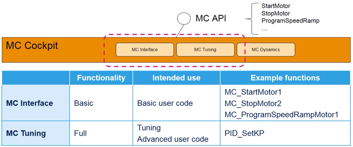 MC API는 User application을 작성하기 위한 시작점이다. MC Interface는 기본 function set을 작성할 수 있고, MC Tuning은 모터 제어를 튜닝할 수 있는 function으로 구성되어 있다.